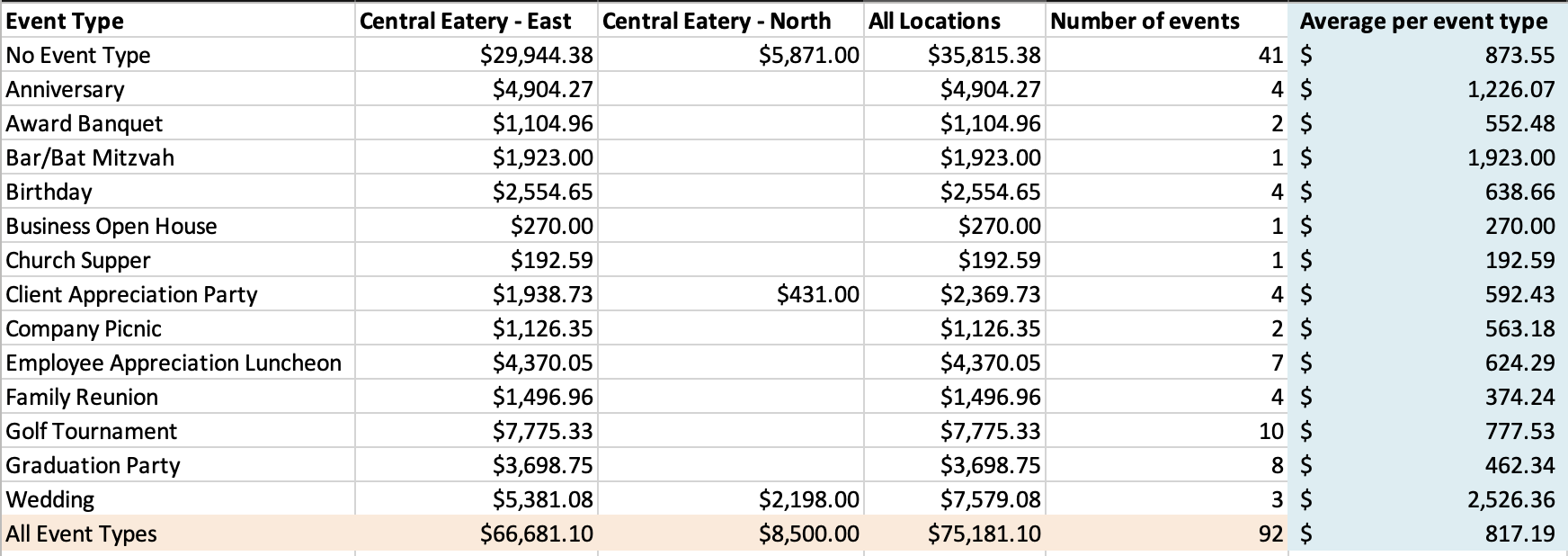 Example: If Corporate Lunches brought in $12,000 over 30 orders, your average revenue per event is $400. If Weddings brought in $18,000 from just 3 events, that’s $6,000 each. You now know where to fish.